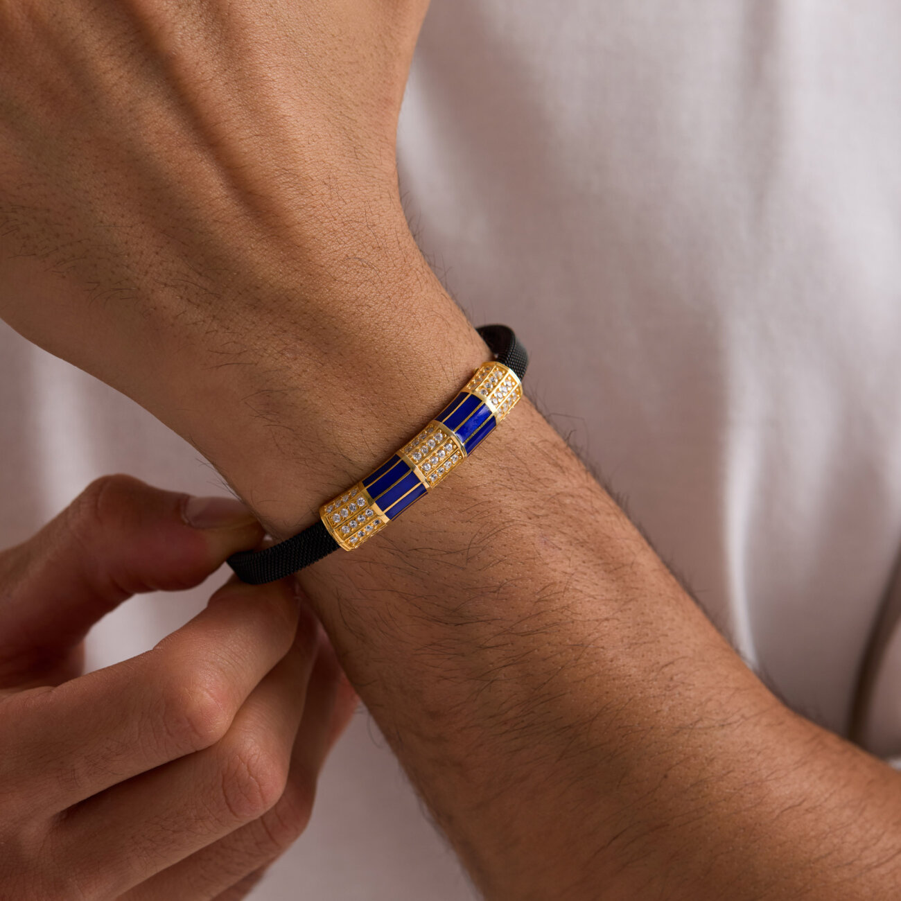 Çelik kol üzerine lacivert mineli, White Signity taşlı, 925 ayar üzerine mikron altın kaplama bileklik olup kendinden ayarlı şekilde tasarlanmıştır.