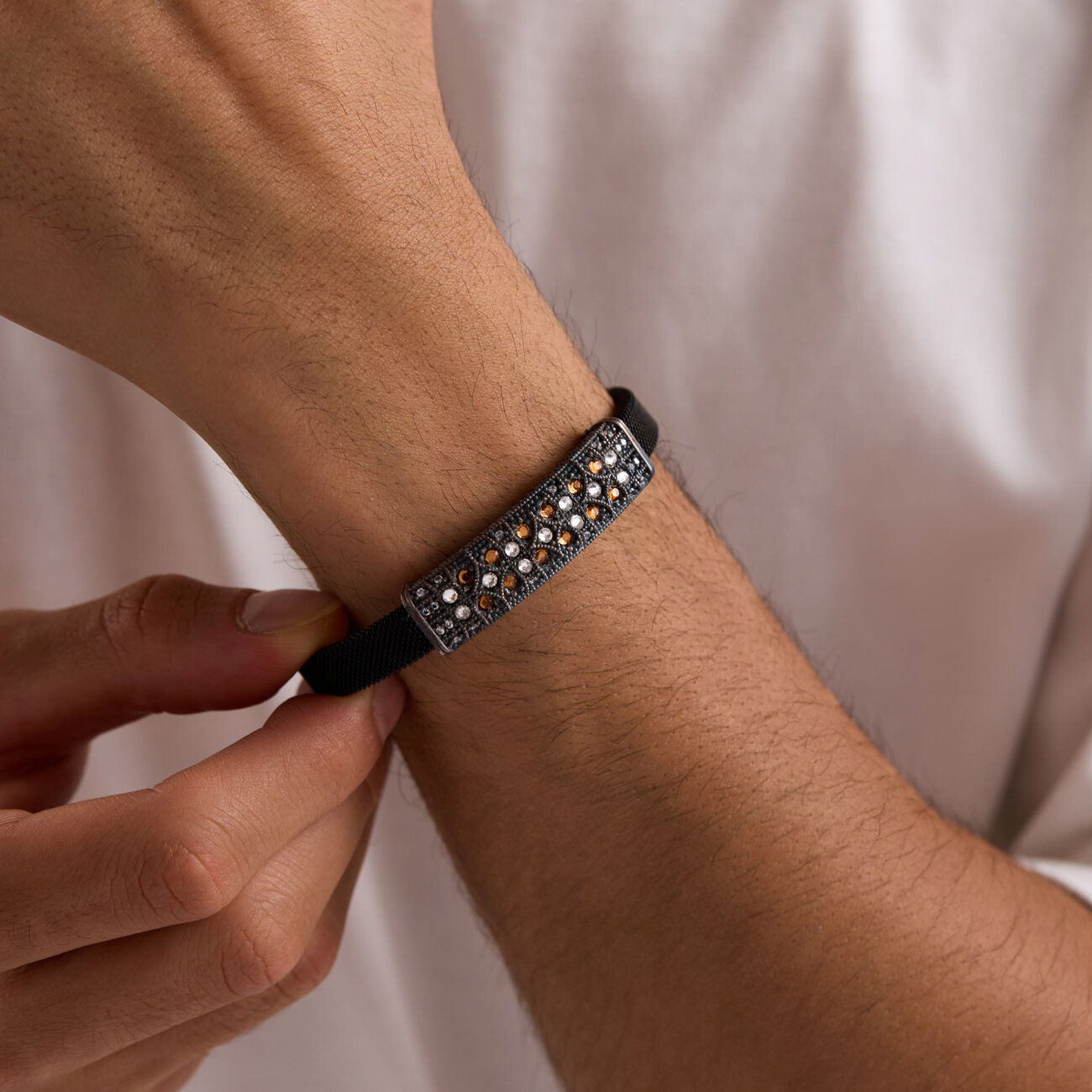 Çelik kol üzerine elmas kesim Braun ve Beyaz Signity taşlı, 925 ayar üzerine mikron altın kaplama bileklik olup kendinden ayarlı şekilde tasarlanmıştır.