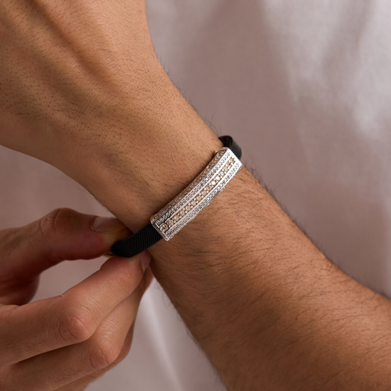 Çelik kol üzerine Champagne taşlı, 925 ayar üzerine mikron altın kaplama bileklik olup kendinden ayarlı şekilde tasarlanmıştır.