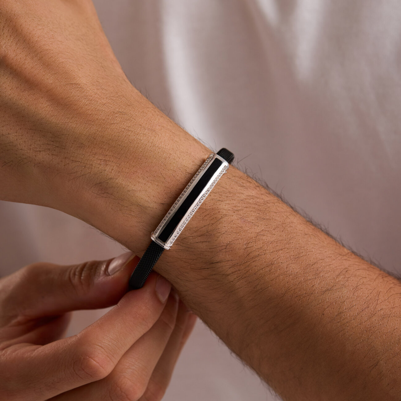 Çelik kol üzerine siyah mineli, Beyaz Signity taşlı, 925 ayar üzerine mikron altın kaplama bileklik olup kendinden ayarlı şekilde tasarlanmıştır.