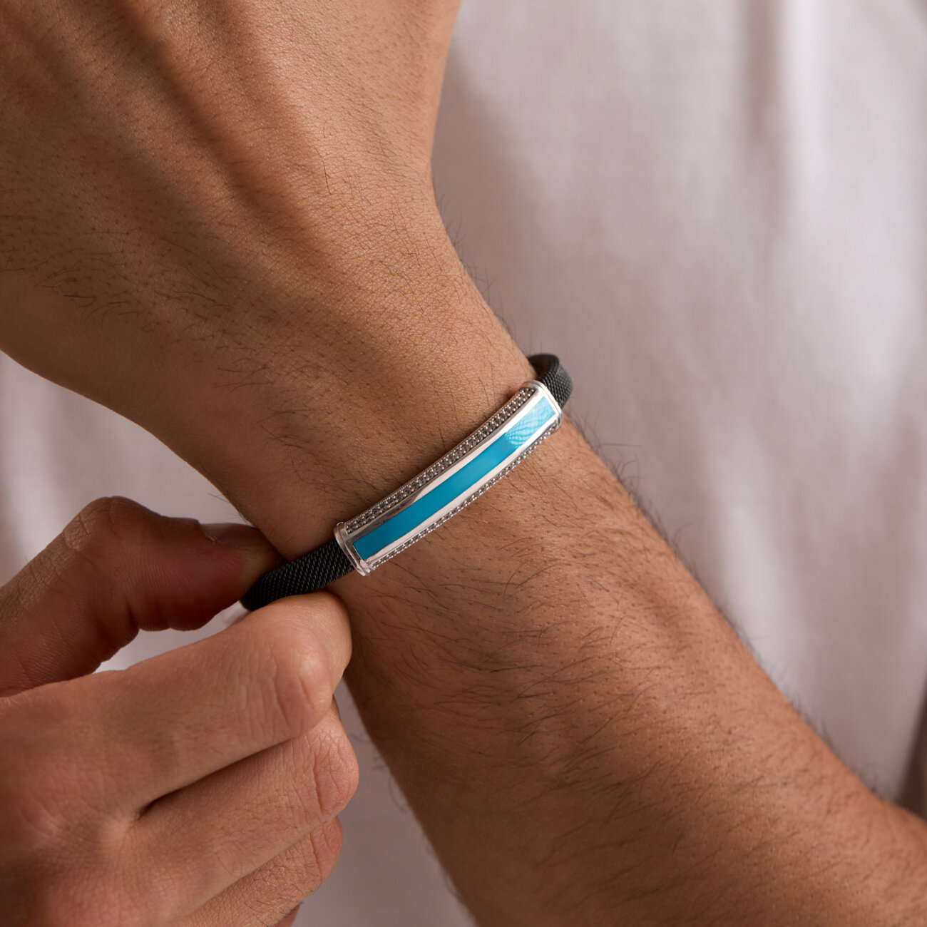 Çelik kol üzerine yapılmış 925 ayar gümüş ve mikron altın kaplama, turkuaz mineli White Signity taşlarla işlenmiş olup kendinden ayarlı şekilde tasarlanmıştır.