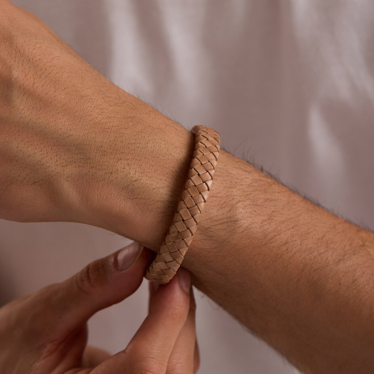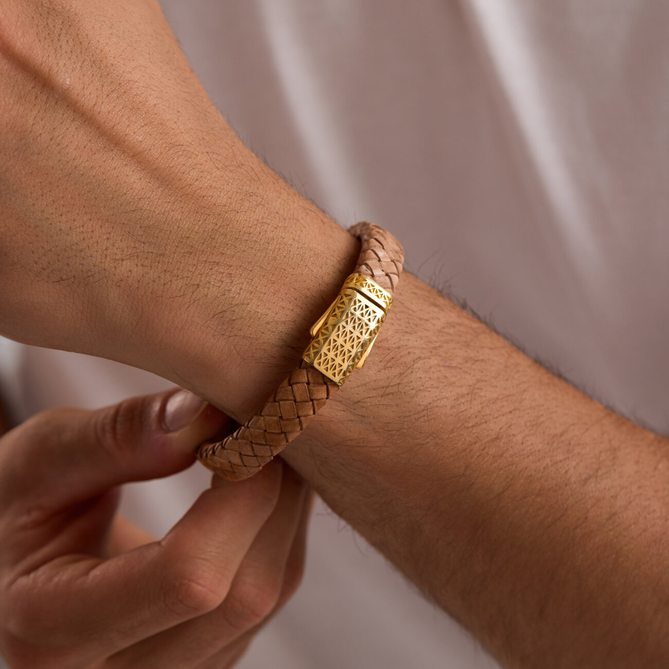 Açık kahverengi örme deri üzerine kilit orta göbek tasarımlı, 925 ayar üzerine mikron altın kaplama bileklik tasarımıdır.