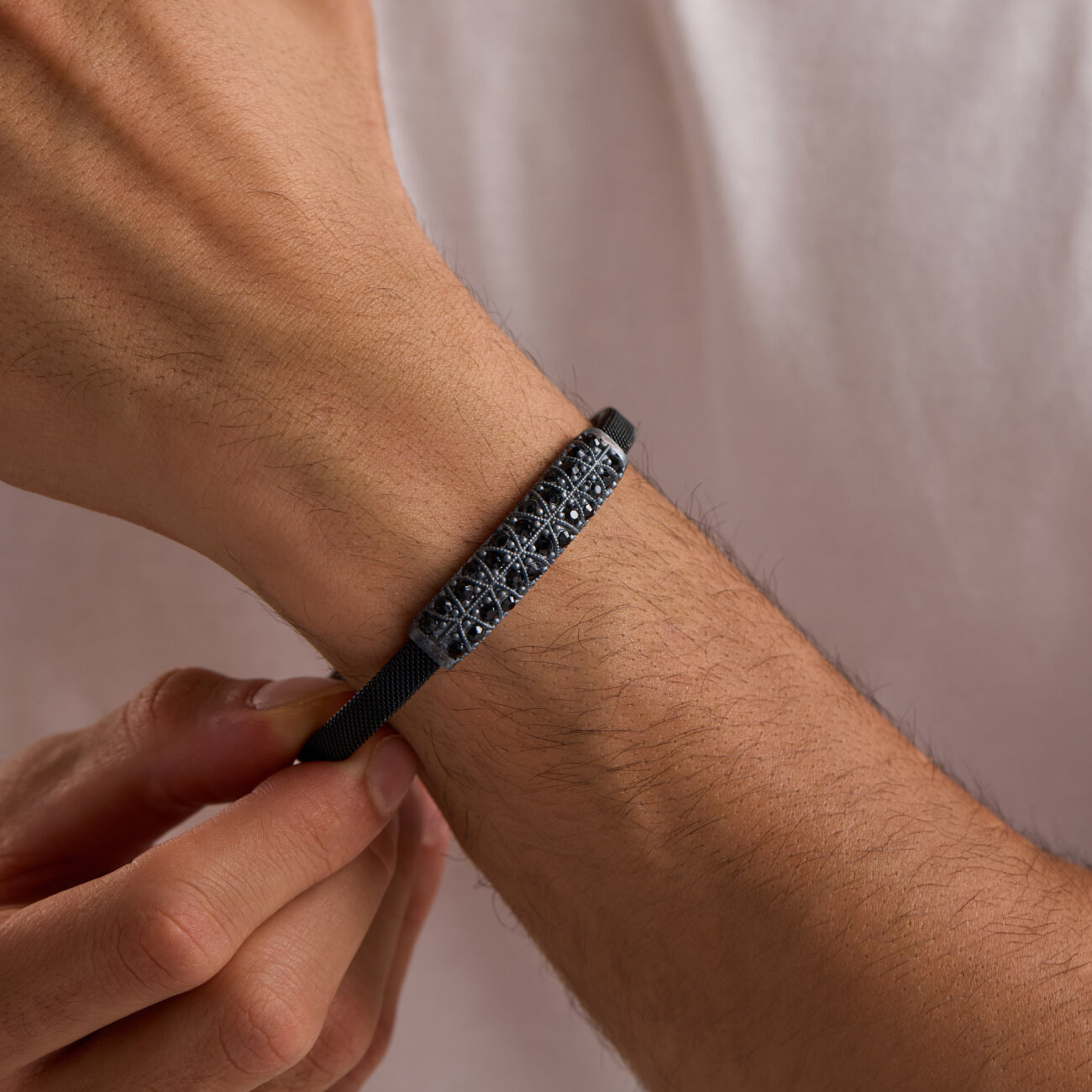 Çelik kol üzerine elmas kesim Siyah Signity taşlı, 925 ayar üzerine mikron altın kaplama bileklik olup kendinden ayarlı şekilde tasarlanmıştır.