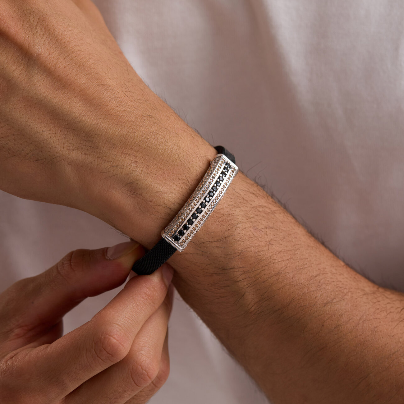 Çelik kol üzerine Onyx ve Champagne taşlı, 925 ayar üzerine mikron altın kaplama bileklik olup kendinden ayarlı şekilde tasarlanmıştır.