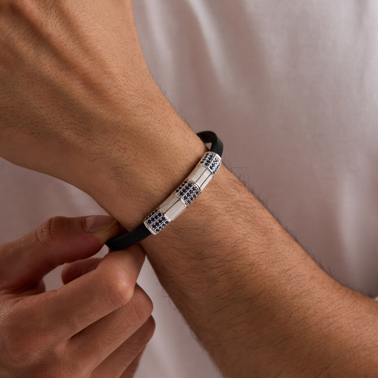 Çelik kol üzerine yapılmış 925 ayar gümüş üzerine mikron altın kaplama, beyaz sedef mineli, parlement mavisi taşlarla işlenmiş olup kendinden ayarlı şekilde tasarlanmıştır.