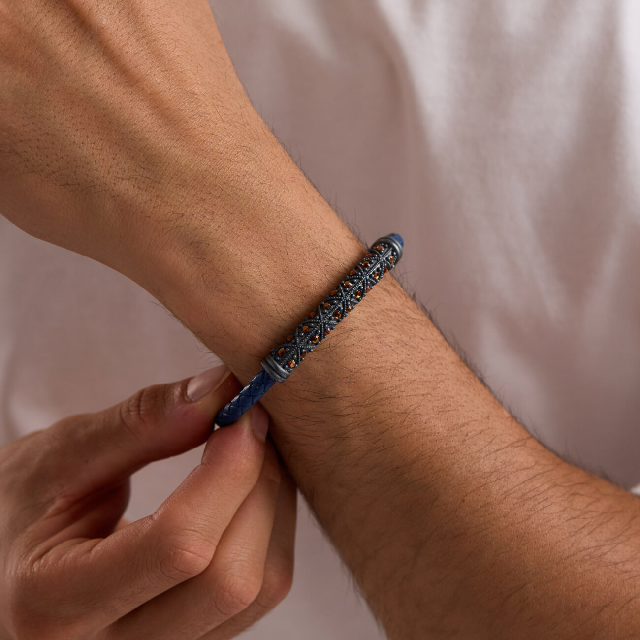 Çelik kol üzerine lacivert örgü deri tasarımlı, elmas kesim Braun taşlı eskitme, 925 ayar üzerine mikron altın kaplama bileklik olup kendinden ayarlı şekilde tasarlanmıştır.